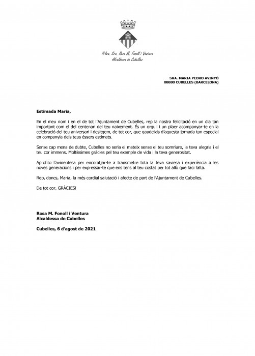 L’Ajuntament de Cubelles ha homenatjat aquest divendres dia 6 d’agost la cubellenca Maria Pedro i Aviñó pel centenari del seu naixement. L’alcaldessa de la vila, Rosa Fonoll, i la regidora de la Gent gran, Alexandra Corvillo, s’han desplaçat fins al seu domicili per lliurar-li una carta de felicitació, un ram de flors i una placa commemorativa entre d’altres obsequis.