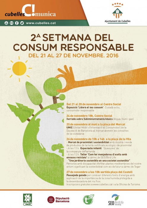 Durant tota la setmana, del 21 al 27 de novembre, Cubelles acull la 2a edició de la Setmana del Consum Responsable amb tot un seguit d’activitats per conscienciar la ciutadania de la necessitat de reflexionar quan s’és consumidor: drets, deures i les oportunitats de contribuir a la preservació del medi ambient exercint una actitud de consum responsable.