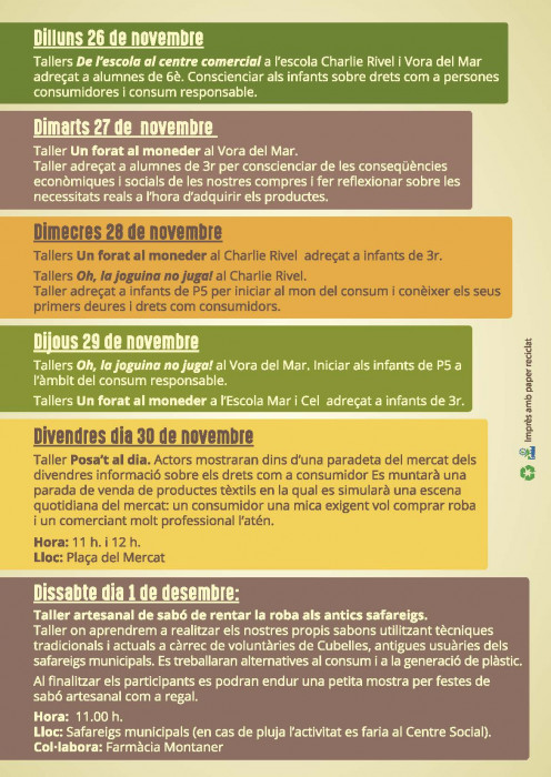 De dilluns a dijous les activitats es concentraran en les escoles del municipi oferint tallers per a diferents cursos com P5, 3r i 6è de primària. Aquestes iniciatives busquen començar des de ben petits a donar consells i educar en consum responsable fent pedagogia dels drets i deures que tenim com a consumidors. El divendres 30 de novembre, coincidint amb al mercat setmanal, s’oferirà un taller anomenat Posa’t al dia, on uns actors obriran una paradeta i de forma dinàmica i divertida escenificaran situacions quotidianes entre consumidors i venedors. Aquest taller és una novetat que la Diputació de Barcelona ha decidit oferir a Cubelles en el marc de la Setmana de consum responsable.