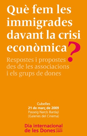 La commemoració del Dia Internacional de les Dones 2009 segueix amb una jornada que tindrà lloc el proper 21 de març a les galeries del cinema Mediterrani (Passeig Narcís Bardají) i que duu per títol “Què fem les immigrades davant la crisi econòmica? Respostes i propostes des de les associacions i els grups de dones”. L’acte l’inauguraran a les 11 del matí l’Alcaldessa de Cubelles, Maria Lluïsa Romero, i la presidenta de l’Institut Català de les Dones, Marta Selva i posteriorment es celebrarà una conferència d’”Estratègies d’autoocupació i de dones emprenedores”.