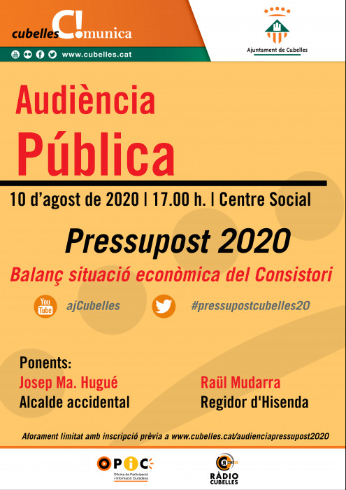 El govern municipal donarà a conèixer el projecte de pressupost 2020 en una audiència pública programada per al proper dilluns 10 d'agost a les 17 hores al Centre Social Roig i Piera. La sessió serà oberta al públic però amb aforament limitat a 15 persones. També s'emetrà en directe al canal municipal de YouTube, podent-se recuperar el vídeo un cop finalitzada l'audiència pública. Per poder-hi assistir presencialment cal realitzar la inscripció prèvia al web municipal.