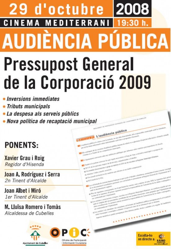 El cinema Mediterrani acollirà una nova audiència pública el proper avui a partir de les 19:30h. Novament l’equip de Govern presentarà públicament el pressupost general de la Corporació per a l’exercici del 2009, tal i com ja es va fer ara fa un any amb els pressupostos del 2008. Aquesta audiència pública comptarà amb les ponències del regidor d’Hisenda, Xavier Grau; el segon Tinent d’Alcalde, Joan A. Rodríguez Serra; el primer Tinent d’Alcalde, Joan Albet; i l’Alcaldessa de Cubelles, M. Lluïsa Romero; i novament estarà moderada per la cap de l’Oficina Participació i Informació Ciutadana (OPIC), Inés Moreno.