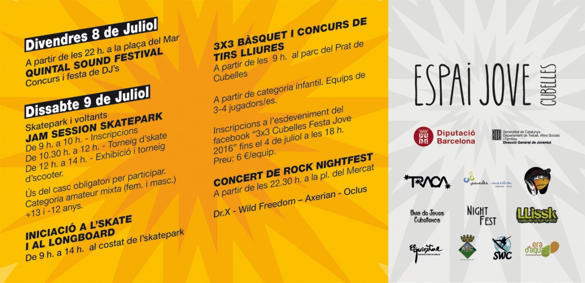 Dissabte a la zona del skatepark va tenir lloc la jornada esportiva, amb el 3x3 de bàsquet i concurs de triples organitzat pel grup de joves Unió de Joves Cubellencs, i la Jam session d’skate i scooter promoguda per LLissK. També es va comptar amb Surfing World Cubelles, que oferia la possibilitat d’iniciar-se en l’skate i el longboard.