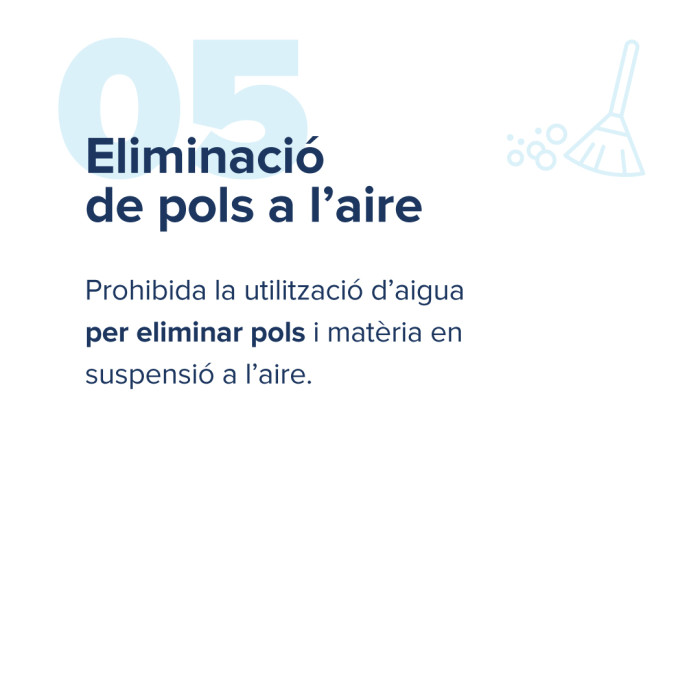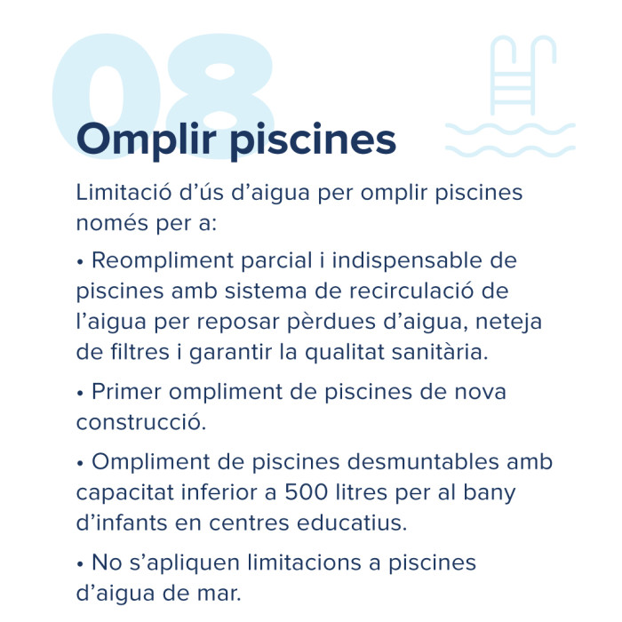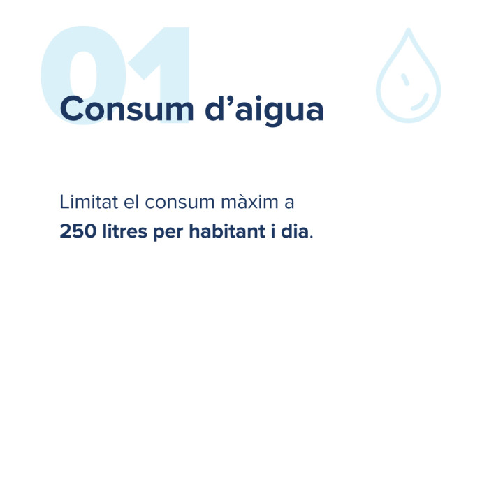 Limitació del consum global d'aigua per abastament a un màxim de 250 litres per habitant i dia. Tots aquells municipis que, un cop aplicades les limitacions particulars, presentin dotacions en alta superiors a aquesta, hauran de prendre mesures addicionals per garantir que no se supera aquest llindar.