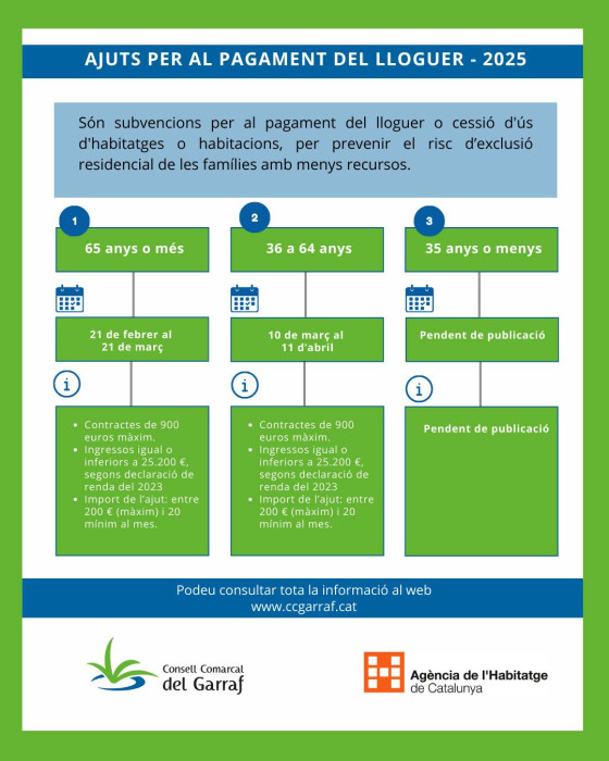 La primera convocatòria que s’ha obert està adreçada a persones, que a data de 31/1/25 tinguin 65 anys o més i siguin titulars d'un contracte de lloguer o cessió d'ús d’un habitatge que constitueixi el seu domicili habitual i permanent.