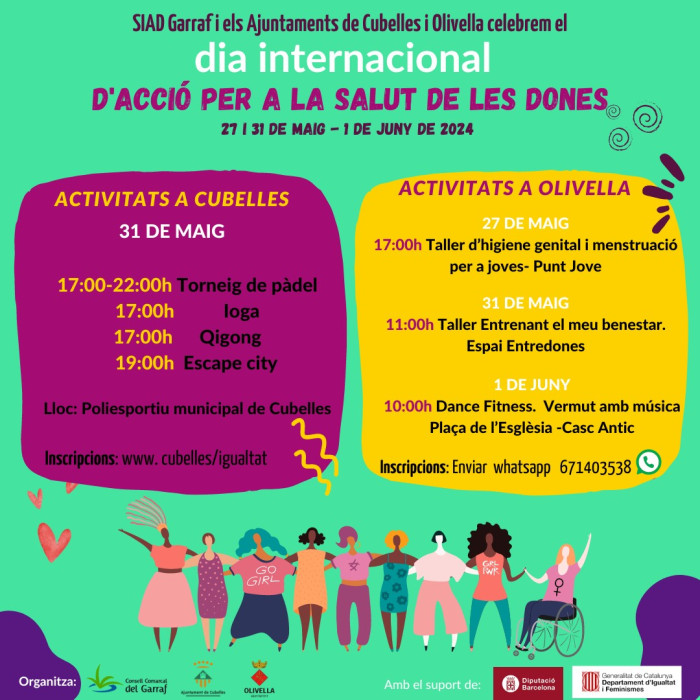 Cubelles commemora el Dia Internacional d’Acció per a la Salut de les Dones amb un ventall d’activitats esportives i lúdiques que tindran lloc el divendres 31 de maig al poliesportiu municipal i que s'han organitzat conjuntament des de la Comissió d'Igualtat del Consell Comarcal del Garraf i els ajuntaments de Cubelles i Olivella.