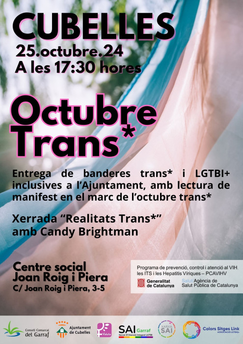 La jornada reivindicativa institucional tindrà lloc el divendres, 25 d’octubre al Centre Social. A les 17.30 h el SAI Garraf farà entrega a l’Ajuntament d'una bandera trans i una bandera LGTBI+ inclusiva, en un acte en què també es durà a terme la lectura del manifest. En acabar tindrà lloc la xerrada “Realitats Trans”, a càrrec de Candy Brightman, de l'associació LGTBIQ+ Colors Sitges Link.