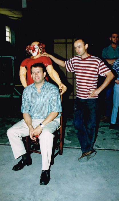 L’origen de l’estàtua es troba en l’amistat que va teixir Farrés amb un artista d’Igualada especialitzat en les escultures de cartró pedra. Junts van decidir elaborar una figura anual de catalans il·lustres com Jacint Verdaguer, Antoni Gaudí i Domènech i Montaner, entre d’altres. L’estàtua de Charlie Rivel es va exposar per primera vegada a la capital de l’Anoia el 1996, arran d’un homenatge que se li va fer coincidint amb el centenari del seu naixement. En aquell acte, Farrés va conèixer la vídua de l’artista, Margarida Camps, i l’autor de la biografia de Rivel, Jordi Jané.