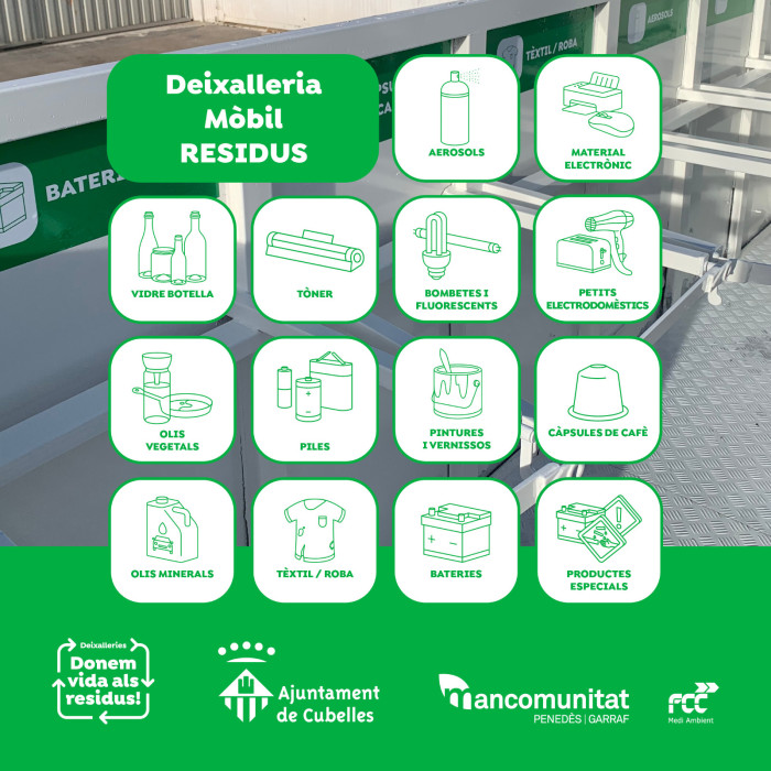 La deixalleria mòbil és un vehicle de transport amb una zona de contenidors per a la recollida i emmagatzematge de residus, sent un punt de proximitat per gestionar aquells residus de petites dimensions que no podem dipositar a la recollida domiciliària.