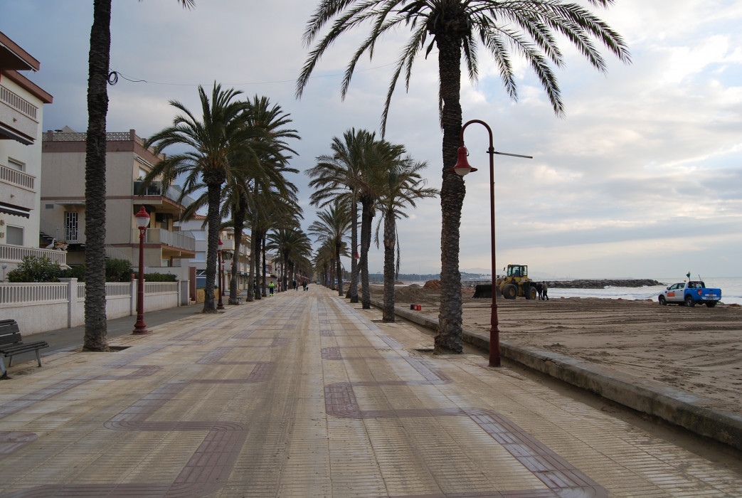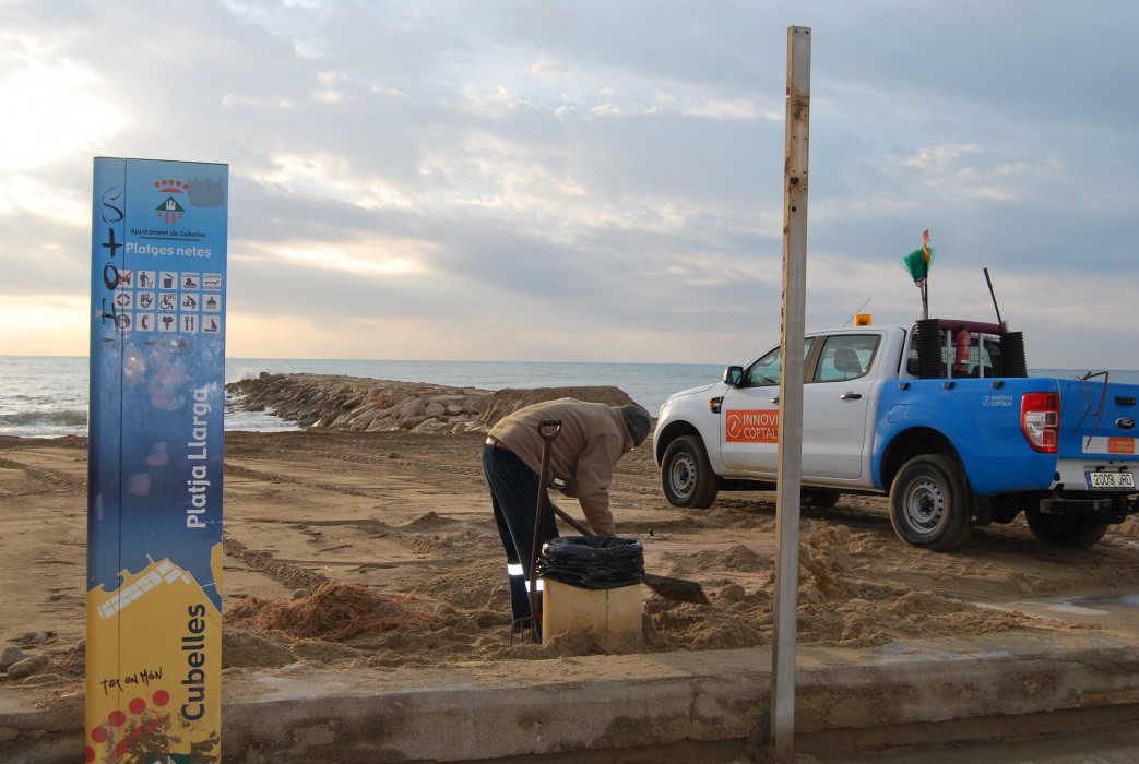 A la primera línia marítima continuen treballant una màquina retroexcavadora encarregada de distribuir la sorra amuntegada al llarg de tota la platja (vegeu vídeo adjunt) i diversos efectius de les empreses concessionàries de la neteja vial del municipi (Cespa) i de la platja (Innovia Coptalia).