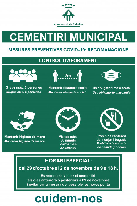 La regidoria de Salut ha preparat un dispositiu especial per poder fer les tradicionals visites al cementiri municipal al voltant de la festivitat de Tots Sants amb totes les garanties sanitàries. Per aquest motiu, s'ha establert un horari especial del 29 d'octubre al 2 de novembre de les 9h. a les 18h. ininterrompudament. Amb tot, es recomana evitar en la mesura del possible les visites el dia 1 de novembre per reduir les concentracions de persones.