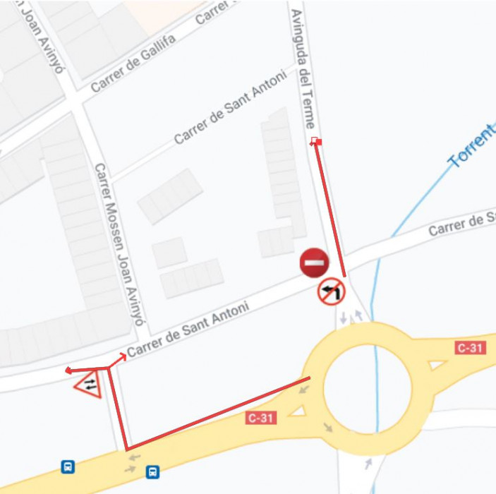 Els vehicles ara es distribuiran amb els que volen anar cap a la zona nord el municipi, que ho faran per l'avinguda del Terme i distribuint-se entre els carrers de Sumella i d'Amadeu Vives. Per contra, els que van cap a la zona del carrer de Mossèn Joan Avinyó i el tram del carrer de Sant antoni entre La Creu i la mateixa avinguda del Terme, hauran de continuar per la C-31 i entrar per l'antiga entrada de la carretera al municipi, al carrer de Mn. Joan Avinyó.