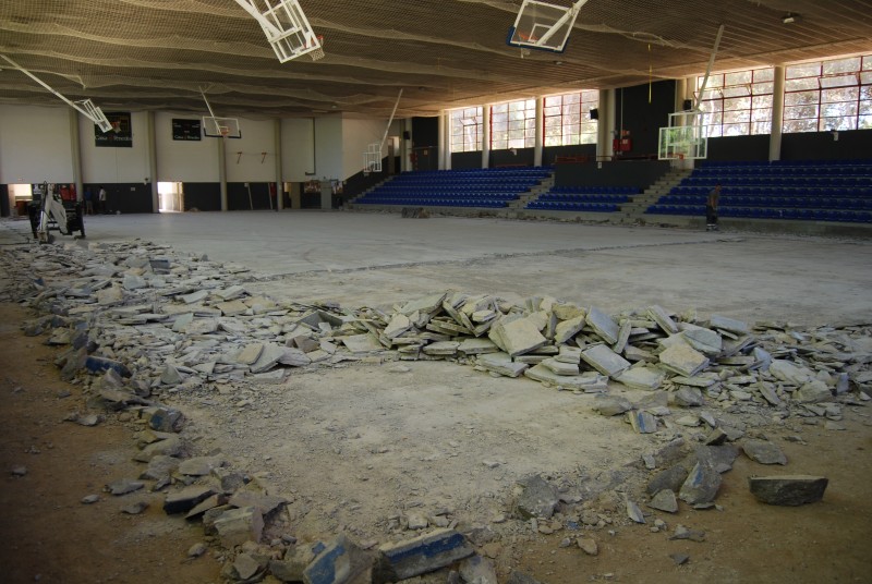 El terratzo actual data de 1975, i el nou paviment permetrà la pràctica esportiva de bàsquet, futbol sala, hoquei patins i patinatge artístic. L’actuació resoldrà les deficiències de planimetria de l’actual superfície, ja que la pista va ser construïda com a pista exterior amb les corresponents pendents per a l’evacuació de l’aigua. Anys més tard va cobrir-se amb la construcció del pavelló, però no va modificar-se el paviment de joc.