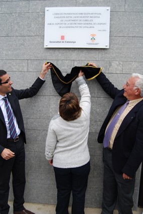 Amb una lluïda festa, pensada per als nens i nenes del municipi, Lluís Pineda, regidor d’Esports; Jesús Aurer, coordinador territorial de la Secretaria General de l’Esport; i Maria Lluïsa Romero, Alcaldessa de Cubelles, van inaugurar oficialment la nova gespa del camp de futbol municipal Josep Pons i Ventura aquest dissabte. La descoberta de la placa inaugural i la sacada d’honor des de la mateixa gespa van centrar un acte molt emotiu.