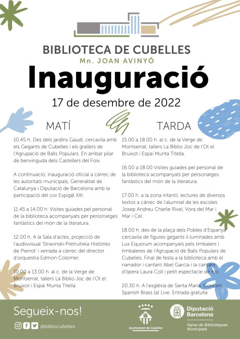 Els actes arrencaran amb una cercavila amb la participació dels Gegants de Cubelles, acompanyats dels grallers de l'Agrupació, des del parc Gaudí fins a la porta de la biblioteca municipal de Cubelles. Allà es destaparà la placa inaugural i tindrà lloc els parlaments, una breu actuació del cor Espig@ XXI i una visita institucional a l'equipament. Seguidament, s'obriran al públic les activitats i tallers adreçats a públic familiar i les visites guiades a la biblioteca, que aniran a càrrec del personal de la mateixa i acompanyats per uns personatges onírics de la literatura.