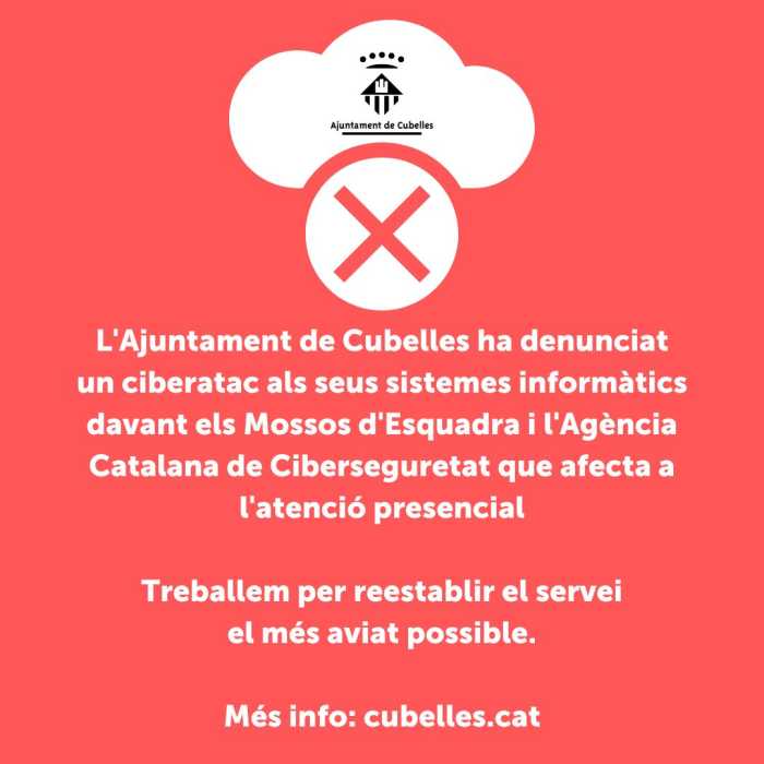 L’Ajuntament de Cubelles ha patit un ciberatac que actualment impedeix l’accés al sistema informàtic.