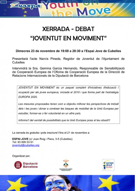 La regidoria de Joventut, juntament amb la Diputació de Barcelona i la Comissió Europea, organitzen la xerrada – debat “Joventut en Moviment”, el dimecres 23 de novembre a les 19 hores a l’Espai Jove.