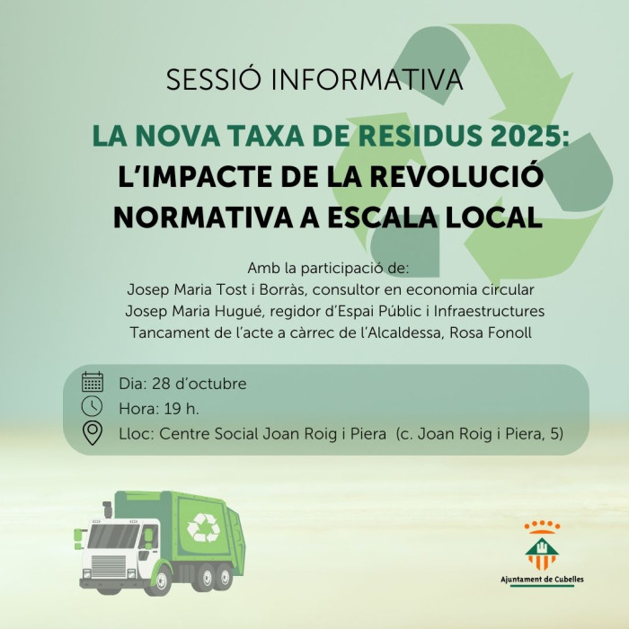 L’Ajuntament de Cubelles convoca a la ciutadania a una xerrada informativa sobre la taxa de residus el proper dilluns 28 d’octubre a les 19 h al Centre Social Joan Roig i Piera.