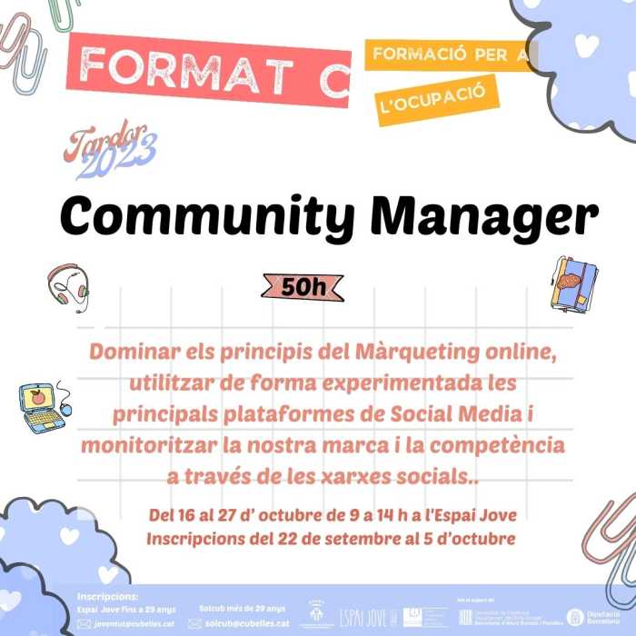 La programació de cursos Format C, de l’Espai Jove i el Solcub, per a aquesta tardor ja està en marxa. Des del mes de setembre i fins el desembre, l’Espai Jove acollirà 7 formacions entre les que hi ha community manager, funcions bàsiques de l’auxiliar de comerç, vetllador/a d’infants amb NEE, emergències i primers auxilis, monitor/a de menjador i operació de carretons.