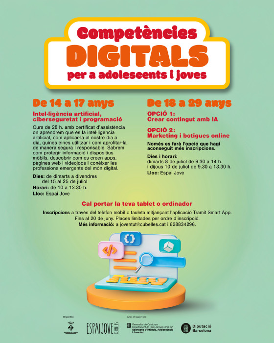 També s'estrenen aquest any els cursos de competències digitals. Per als joves de 14 a 17 anys s’ofereix el curs “Intel·ligència artificial, ciberseguretat i programació”, que tindrà lloc del 15 al 25 de juliol, de dimarts a divendres, de 10 a 13.30 h. Per als joves d’entre 18 i 29 anys s’han previst dues opcions formatives, de les quals es durà a terme aquella que obtingui més inscripcions: “Crear contingut amb intel·ligència artificial” i “Màrqueting i comerç en línia”. Ambdues estan previstes per als dies 8 i 10 de juliol al matí. Per participar en aquests cursos és necessari disposar d’una tauleta o ordinador portàtil. Les inscripcions estan obertes fins al 20 de juny a través de l’app Tràmit. Els cursos són gratuïts i els ofereix Fundació Cibervoluntars.