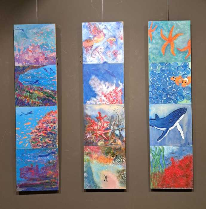La primera de les mostres, que es pot veure des de dilluns passat i fins al 2 de febrer, porta per títol “Fons marí”, i recull obres pictòriques del col·lectiu artístic del Penedès-Garraf Blauet. Es tracta d’una mostra pictòrica que el col·lectiu ha definit com a “experimental”, sobre la riquesa de la biodiversitat del fons marí.