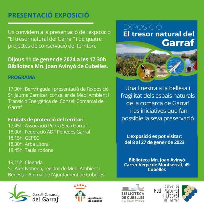 Produïda pel Servei del medi natural i litoral del Garraf, “El tresor natural del Garraf” pretén ser una finestra a la bellesa i fragilitat d'aquests ecosistemes. L’exposició també posa el focus en la protecció del medi i les diferents accions que es duen a terme amb aquest objectiu, com ara programes d'educació ambiental, campanyes de neteja o accions de conservació i restauració.