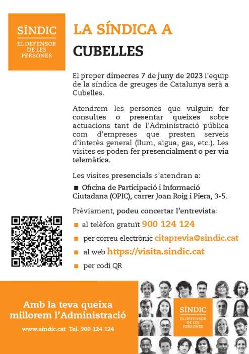 L’equip de la Síndica de Greuges visitarà Cubelles el dimecres 7 de juny amb l’objectiu d’oferir una atenció presencial o telemàtica (trucada o videotrucada) dirigida a veïns i entitats del municipi que vulguin fer consultes o exposar queixes en relació amb vulneracions dels seus drets per part d’administracions públiques i empreses que presten serveis generals (aigua, llum, gas...).