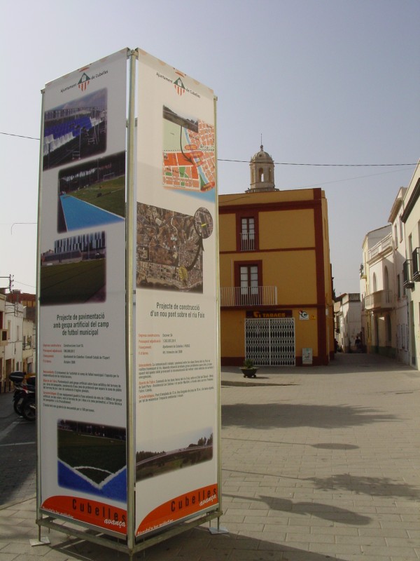 L’Ajuntament de Cubelles ha instal·lat dues torres informatives de quatre cares (4m x 1m) que contenen informació de les obres i actuacions que actualment s’estan duent a terme al municipi. Cadascuna de les quatre cares del plafó conté informació d’un projecte diferent, com ara l’empresa adjudicatària, la previsió d’acabament, el cost de l’obra, diverses dades tècniques i característiques del projecte en qüestió. S’han instal·lat dues torres, una a la Plaça de la Font i l’altra a la sortida de l’andana de l’estació de RENFE a l’Avinguda Onze de Setembre.
