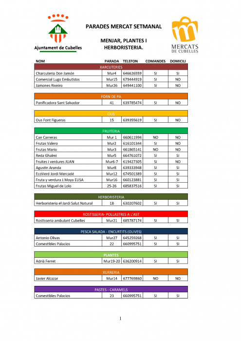 En total hi haurà vint parades, nou de fruites i verdures, tres xarcuteries, dues de pesca salada/olives, i una de pa, ous, herboristeria, rostisseria, plantes, pastes-caramels i la xurreria que també s'instal·la els diumenges. Al llistat adjunt es pot consultar la relació de paradistes que permeten as clients encarregar la compra abans d'anar al mercat i minimitzar el temps d'estada. Així mateix, també s'indica si ofereixen servei a domicili i poder evitar desplaçaments de la ciutadania a la via pública.