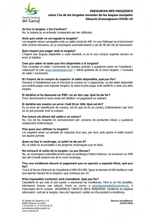 D'acord amb les directrius del departament d'Educació i el de Treball, Afers Socials i Família de la Generalitat de Catalunya, la targeta moneder garantirà als menors beneficiaris d'ajuts de menjador en els nivells educatius de segon cicle infantil, primària i secundària obligatòria, la continuïtat d'aquests ajuts durant el temps que els centres educatius romanguin tancats com a mesura de prevenció i control de la infecció per SASTS-CoV-2 (coronavirus).