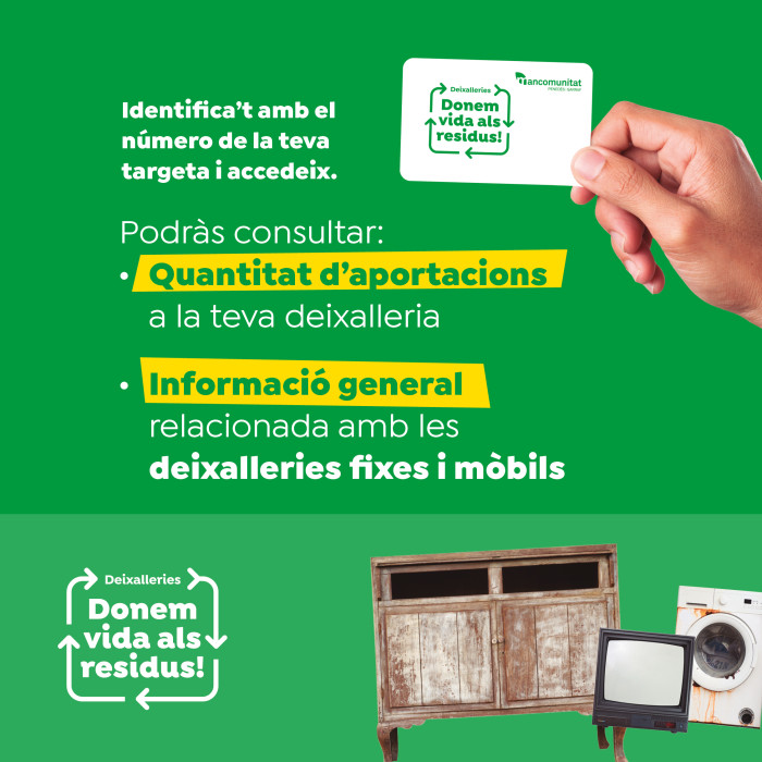 Aquesta eina digital té com a objectiu facilitar l’accés a la informació personalitzada i general sobre les deixalleries fixes i mòbils. Mitjançant la nova plataforma, la ciutadania pot consultar de manera senzilla i àgil les aportacions que ha fet a la deixalleria, així com conèixer el funcionament dels serveis disponibles, els horaris i les condicions d’ús.
