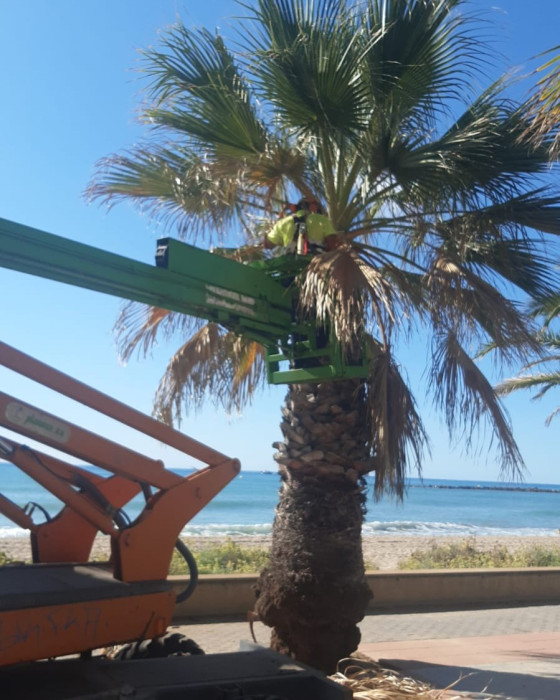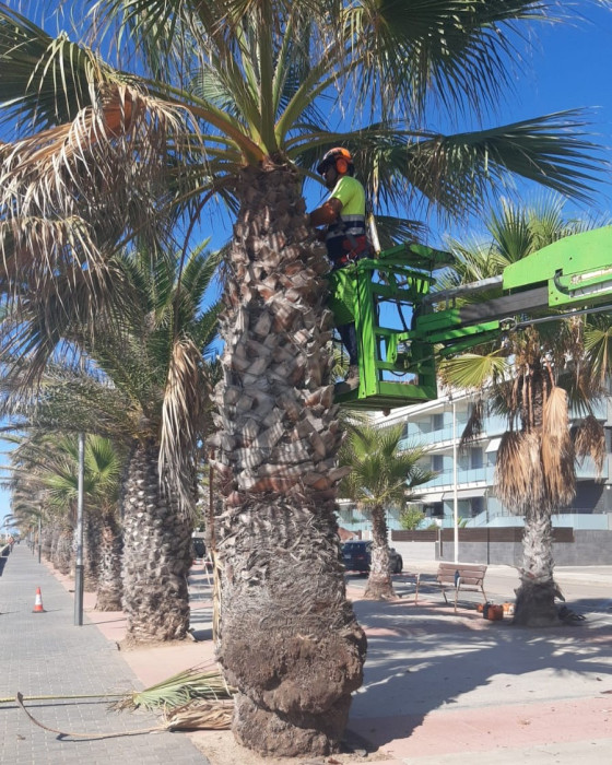 Paral·lelament, han començat també els treballs anuals de manteniment de les palmeres del passeig Mediterrani, que consisteixen en la retirada de dàtils, fulles i part del tronc. Aquestes tasques, que tindran una durada aproximada de dues a tres setmanes, formen part del calendari d’actuacions periòdiques per preservar i embellir l’arbrat. També pel que fa als arbres del municipi, està previst que el servei dugui a terme la poda anual el proper mes d’octubre.
