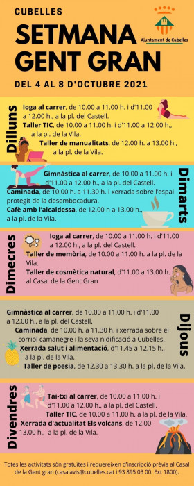Totes les activitats són gratuïtes i requereixen d’inscripció prèvia al Casal de la Gent Gran (casalavis@cubelles.cat i 93 895 03 00 EXT. 1800).