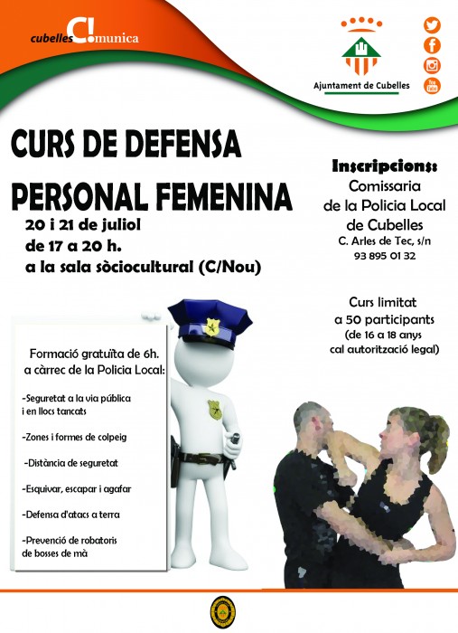 La Policia Local de Cubelles ofereix una nova edició del curs de defensa personal adreçat a dones a partir de 16 anys. Aquesta formació es durà a terme de manera gratuïta els dies 20 i 21 de juliol a la sala sociocultural del carrer Nou de 17 a 20 h. Hi poden participar dones a partir de 16 anys i està limitat a 50 persones. Les noies de 16 a 18 anys caldrà que aportin una autorització legal dels pares, mares o tutors legals a la comissaria de Policia, on poden fer-se les inscripcions presencialment o també per telèfon al 93 895 01 32.