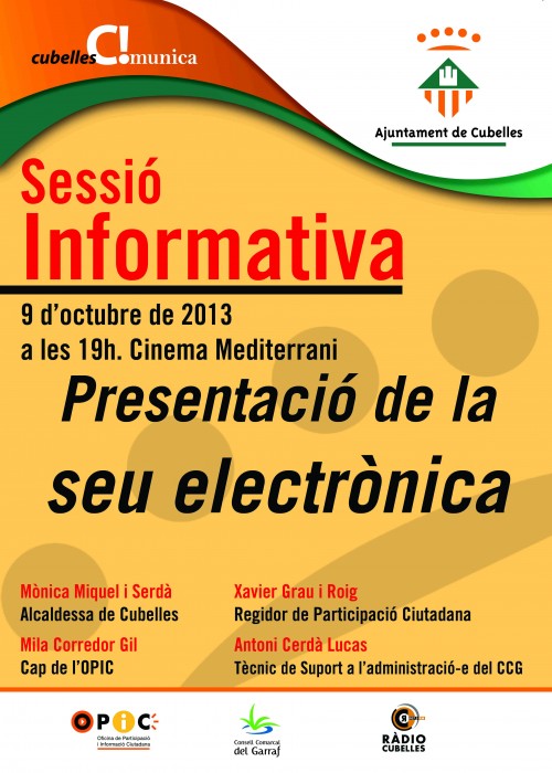 A partir del proper 9 d’octubre, la ciutadania de Cubelles podrà començar a realitzar tràmits amb l’Ajuntament a través d’Internet mitjançant la seu electrònica (seu-e). L’acte de presentació pública tindrà lloc el 9 d’octubre a les 19h. al cinema Mediterrani.
