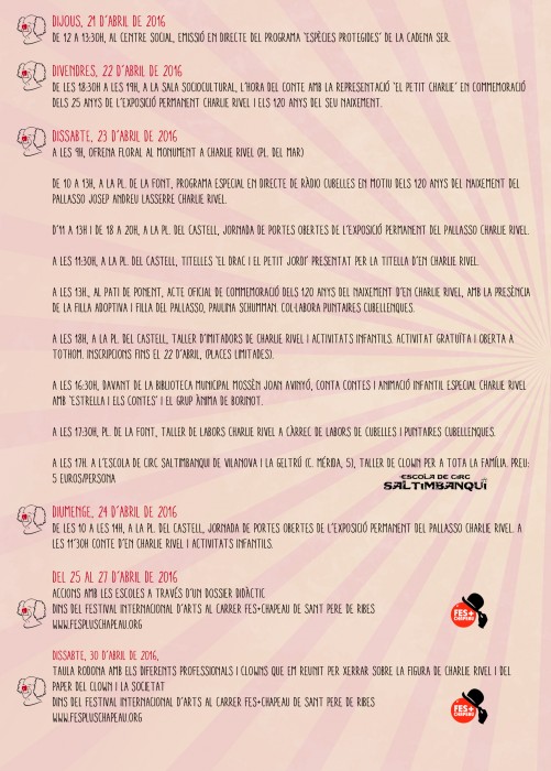 El proper 23 d’abril, Diada de Sant Jordi, Cubelles commemorarà el 120è aniversari del naixement del seu fill il·lustre Josep Andreu Laserre, Charlie Rivel. El pallasso català més universal serà recordat a la seva vila natal amb un ampli programa d’actes que compta amb la col·laboració d’entitats de fora del municipi que han volgut sumar-se a la celebració com Fem+Chapeau de Sant Pere de Ribes o l’escola de circ Saltimbanqui de Vilanova i la Geltrú.