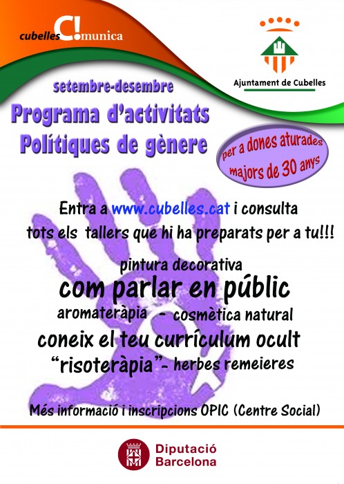 La regidoria de Polítiques d'Igualtat, en col·laboració amb la Diputació de Barcelona, ha preparat un ampli programa de tallers adreçats a dones del municipi en situació d'atur i majors de 30 anys. Les activitats s'emmarquen en dues línies amb objectius ben diferenciats i plantegen una programació que s'allargarà de setembre a desembre de 2013.