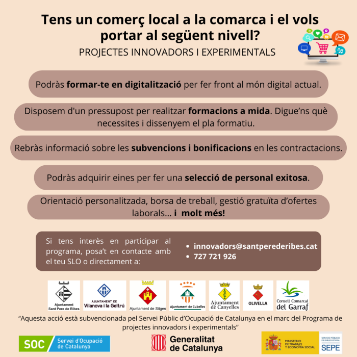 El programa Projectes Innovadors i Experimentals és una acció subvencionada pel Servei Públic d'Ocupació de Catalunya (SOC) en el marc del treball cooperatiu que es fa conjuntament amb tota la comarca del Garraf des dels serveis d'ocupació local. Per a realitzar les inscripcions o sol·licitar més informació es pot enviar un whatsapp al telèfon 727 721 926 o un correu electrònic a innovadors@santperederibes.cat