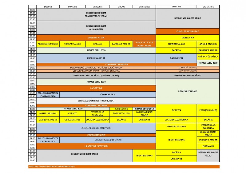 Ràdio Cubelles ha començat la seva programació d’estiu. Des del 14 de juny ja es poden notar els canvis que s’han preparat per aquest període estival. La modificació més rellevant serà l’inici de la programació de tarda, que s’avança dues hores, i passarà a fer-se a les 16h. enlloc de a les 18h. A banda d’això, sobretot, en aquesta època pren més protagonisme la música. Cada dia a les franges d’11h. a 12h. i de 16h. a 17h. sonaran les millors cançons del moment barrejades amb els èxits de sempre. També es donarà una importància especial als músics més propers i a les produccions catalanes.