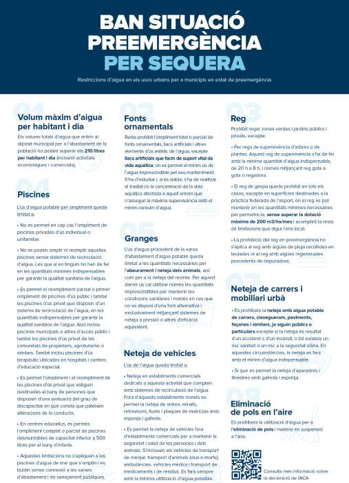 La principal novetat d’aquesta mesura és que es redueix encara més el consum d’aigua domiciliària per persona als 210 litres diaris (incloent-hi activitats econòmiques i comercials). En el cas de Cubelles aquesta xifra és molt superior, arribant als 308 litres/persona/dia que supera, fins i tot, els 230 litres que es permetien en la fase d’excepcionalitat.