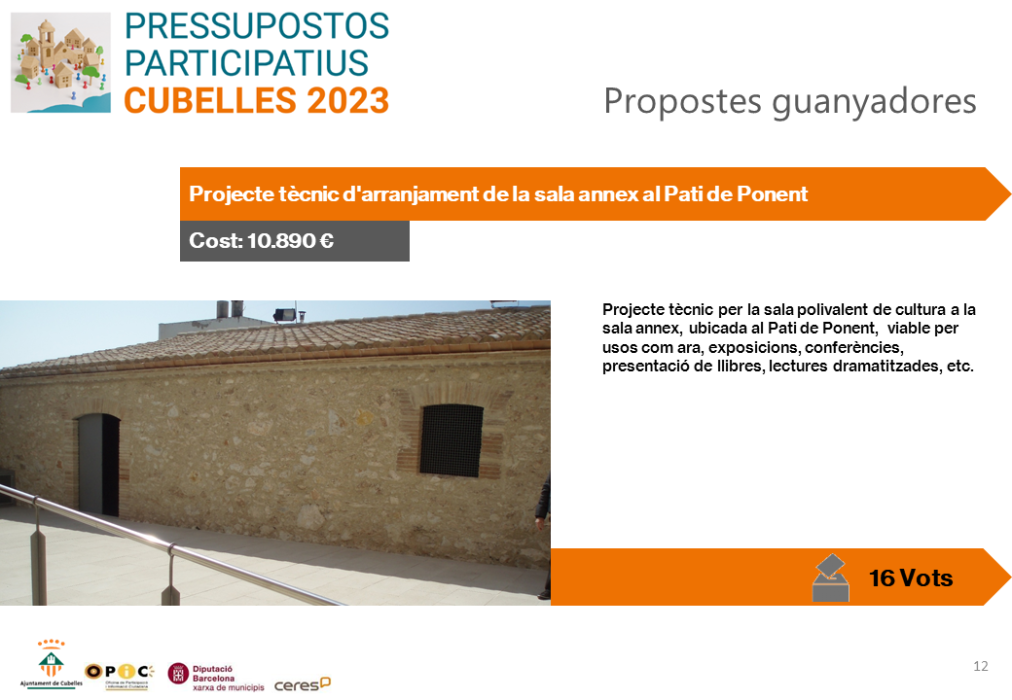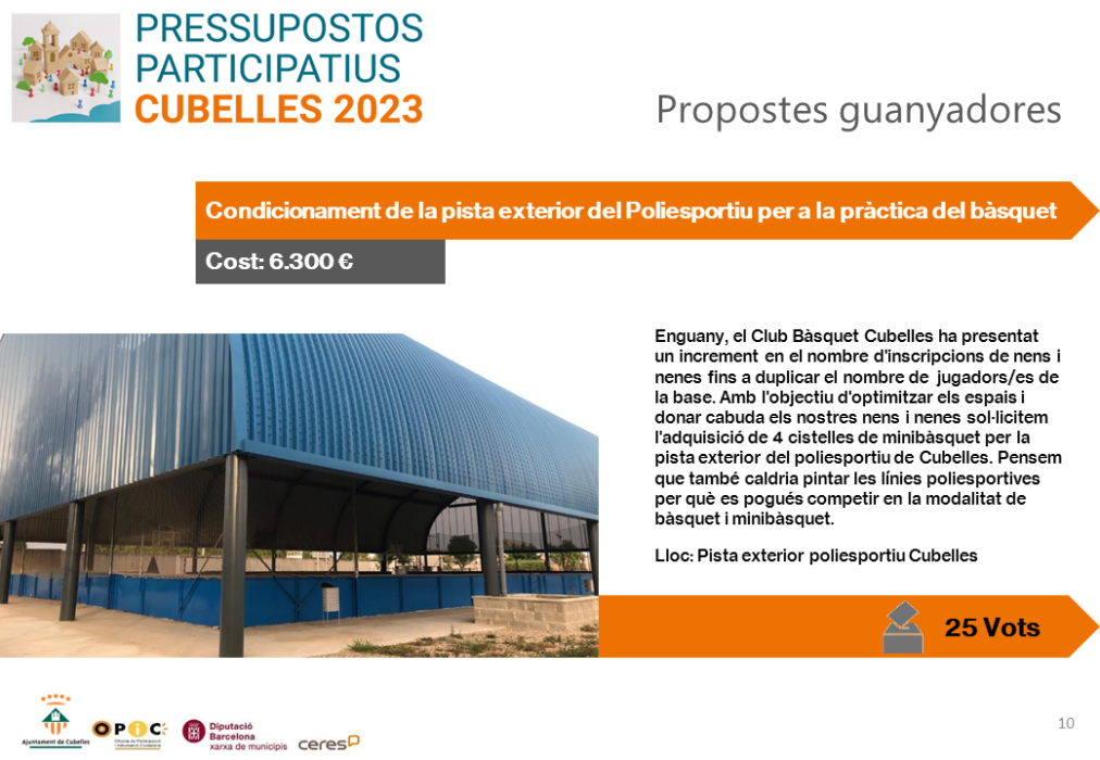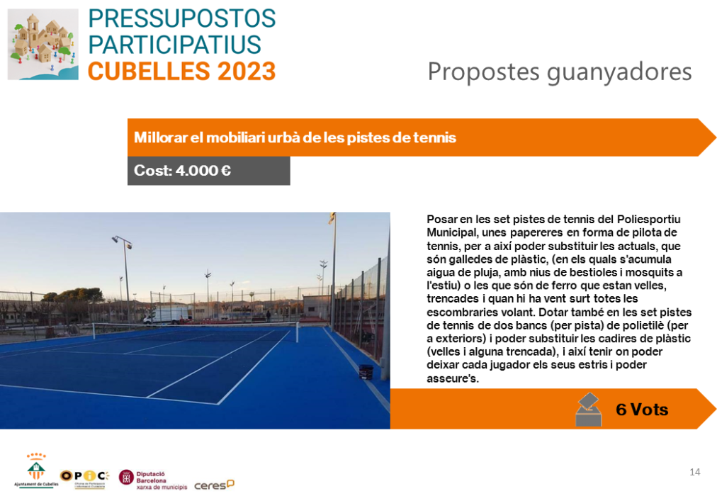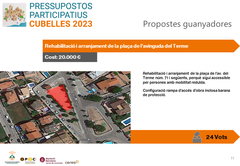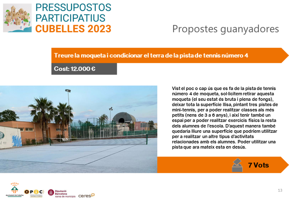 Tal i com estableixen les bases del procés, només s’han atorgat poc més de 100.000€ perquè els projectes amb major nombre de vots, després de l’opció guanyadora, eren d’imports que superaven el límit dels 150.000€ del procés. “Intentarem que aquest excedent de pressupost de gairebé 50.000€ se sumi a la quantitat dels pressupostos participatius de 2024”, ha explicat Capardón. Així, malgrat obtenir més vots, han quedat fora la instal·lació de les plaques fotovoltaiques a La Draga i el Vora del Mar (145.200€) i l’arranjament de la sala polivalent del Pati de Ponent (133.100€), perquè sumades a les quantitats dels projectes precedents en vots excedien l’import total.