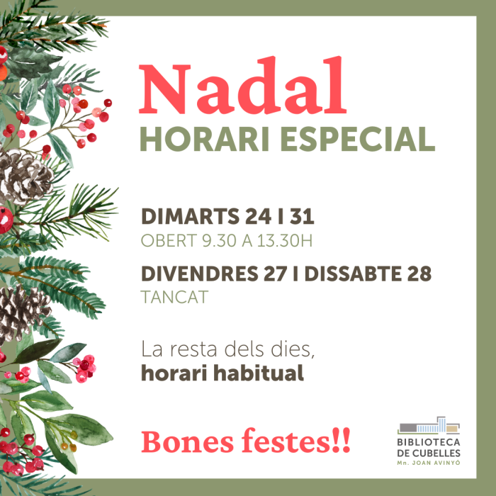 La resta dels dies la Biblioteca realitzarà l’horari habitual