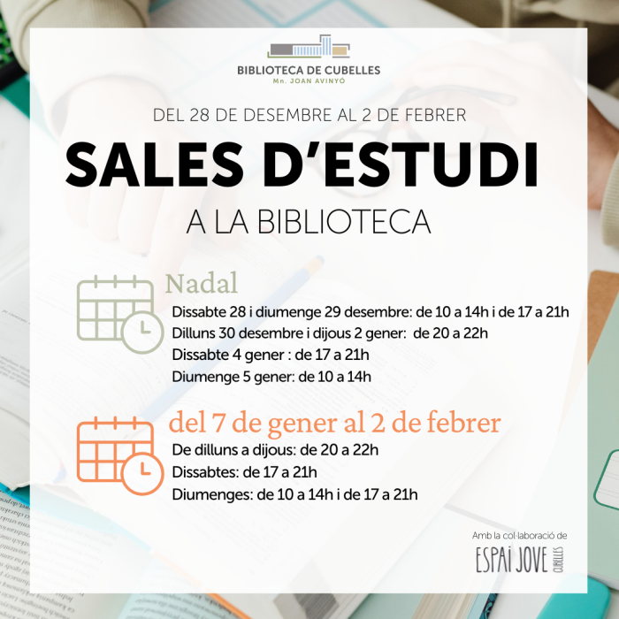 La Biblioteca Mn. Joan Avinyó amplia l’horari de les seves sales d’estudi de forma extraordinària a partir del dissabte 28 de desembre i fins al 2 de febrer, amb l’objectiu de facilitar a l’alumnat la preparació dels exàmens. A més del seu horari habitual, l’equipament tindrà un horari especial durant les festes nadalenques i les següents setmanes.