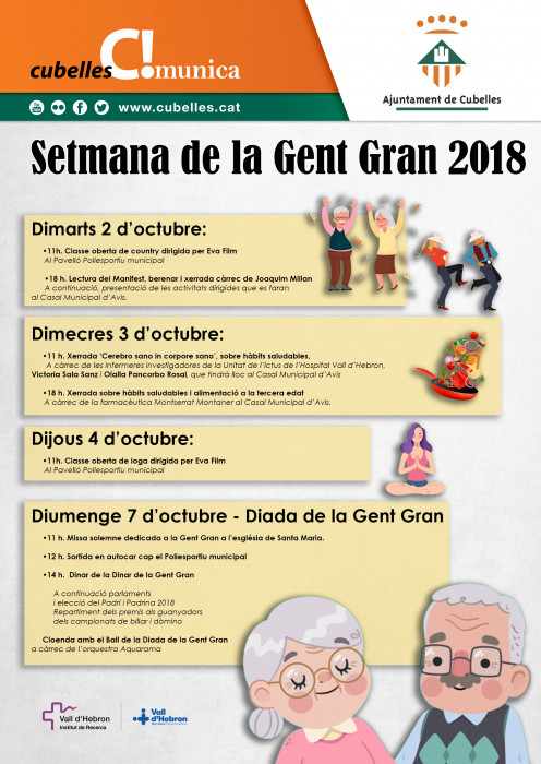 Els actes arrenquen el dimarts 2 d’octubre amb una classe oberta de country, a càrrec de l’empresa local Eva Film, que es portarà a terme al Pavelló Poliesportiu municipal. A les 18h., al Casal d’Avis, tindrà lloc la lectura del manifest del Dia Internacional de la Gent Gran, que es completarà amb un berenar popular i la xerrada de Joaquim Millan, d’Eurolocal. A continuació es presentaran totes les activitats dirigides a la gent gran que es portaran a terme durant tot l’any al Casal Municipal.