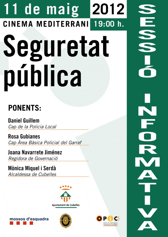El proper 11 de maig, a partir de les 19.00h. al Cinema Mediterrani, tindrà lloc una nova sessió informativa de seguretat pública. Com en els darrers anys, els cossos de la Policia Local i els Mossos d’Esquadra, representats pels seus caps, Daniel Guillem i Rosa Gubianes, respectivament, exposaran les dades en matèria de seguretat ciutadana corresponents a l’any 2011.