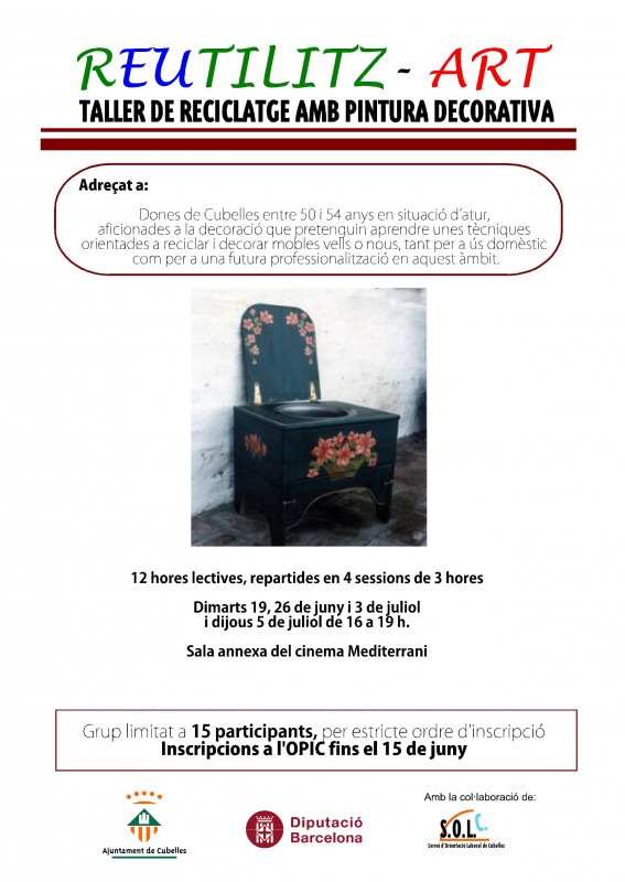 La regidoria de Cooperació i Solidaritat en col·laboració amb la Diputació de Barcelona organitzen un taller de reciclatge amb pintura decorativa que duu per nom Reutilitz-art. Es tracta d’un curs gratuït de 12 hores lectives repartides en 4 sessions de 3 hores que es durà a terme els dies 19 i 26 de juny i 3 i 5 de juliol de 16 a 19h. a la sala annexa del cinema Mediterrani.