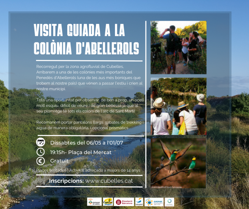 Des d’aquest mes, cada dissabte, hi ha les visites guiades a la recerca de l’Abellerol, una espècie protegida d’origen africà que passa l’estiu i cria a Cubelles. Una de les principals novetats d’aquest any respecte a l’anterior és el canvi de dia, que s’ha passat de dimecres a dissabte a petició dels participants per tal de facilitar l’assistència.