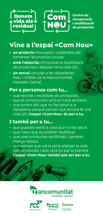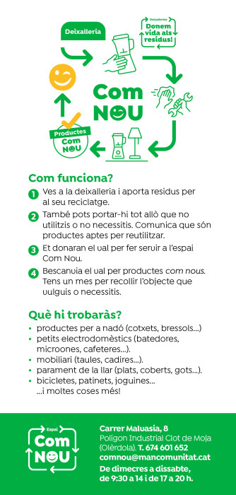 Per conèixer més detalls sobre el funcionament de l’Espai Com Nou, la Mancomunitat ha realitzat un vídeo informatiu que podeu consultar aquí: https://youtu.be/CMK4-1o6NuU