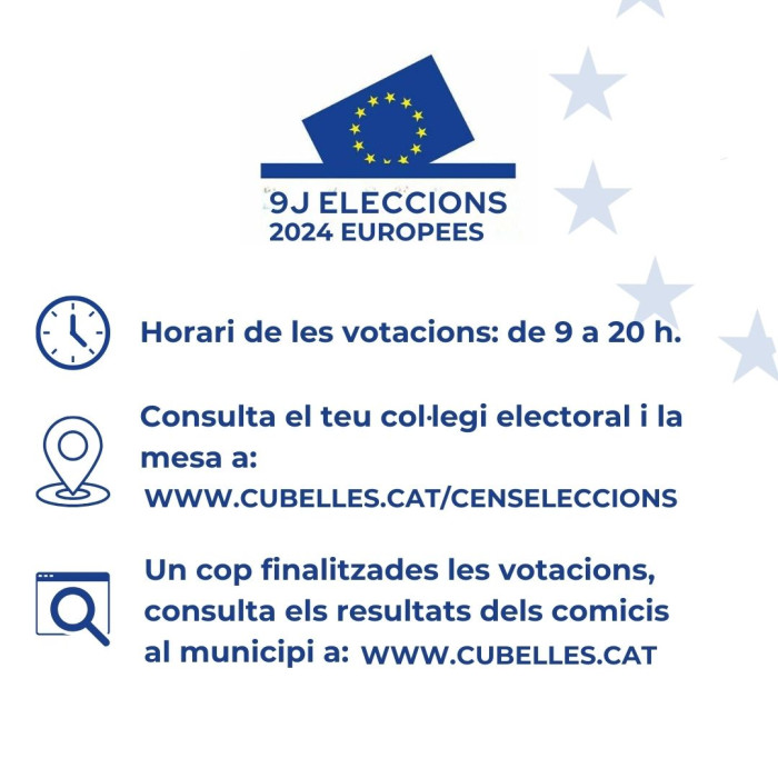 L’Ajuntament de Cubelles té a punt el dispositiu per a les eleccions al Parlament Europeu del proper diumenge, 9 de juny. Un total de 12.529 persones estan cridades a les urnes per escollir els 61 dels 720 eurodiputats europeus que pertoquen a l’Estat espanyol.