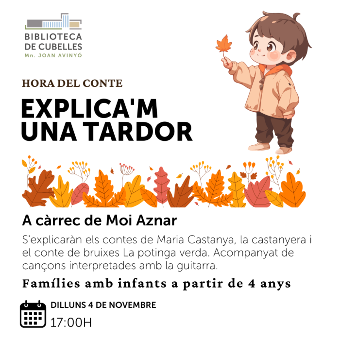 També dirigit a un públic familiar, el 4 de novembre tindrà lloc a la Biblioteca Mn. Joan Avinyó l’espectacle de contes Explica’m una tardor, on s’explicaran els contes de Maria Castanya, la castanyera i el conte de bruixes La potinga verda, acompanyat de cançons interpretades amb la guitarra.